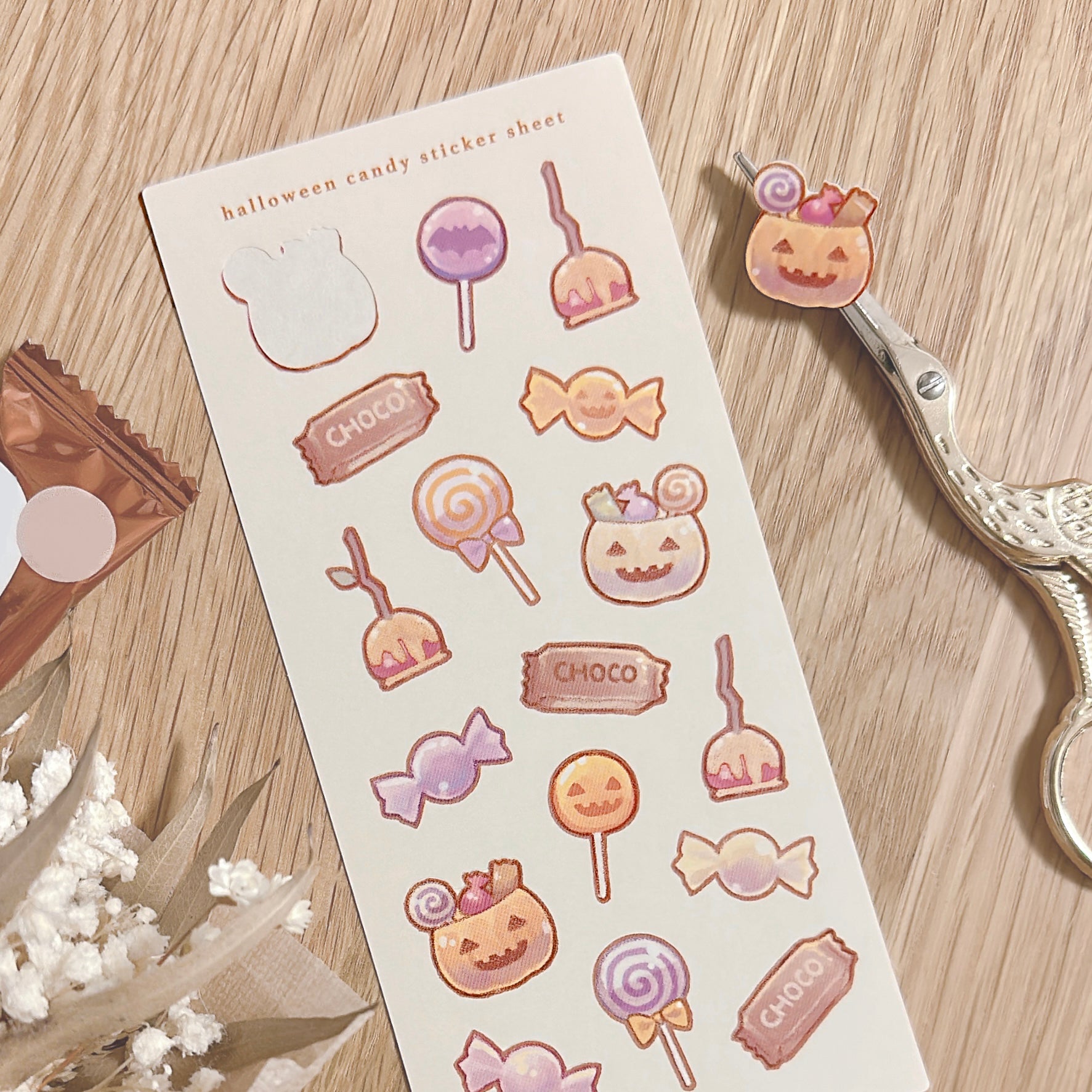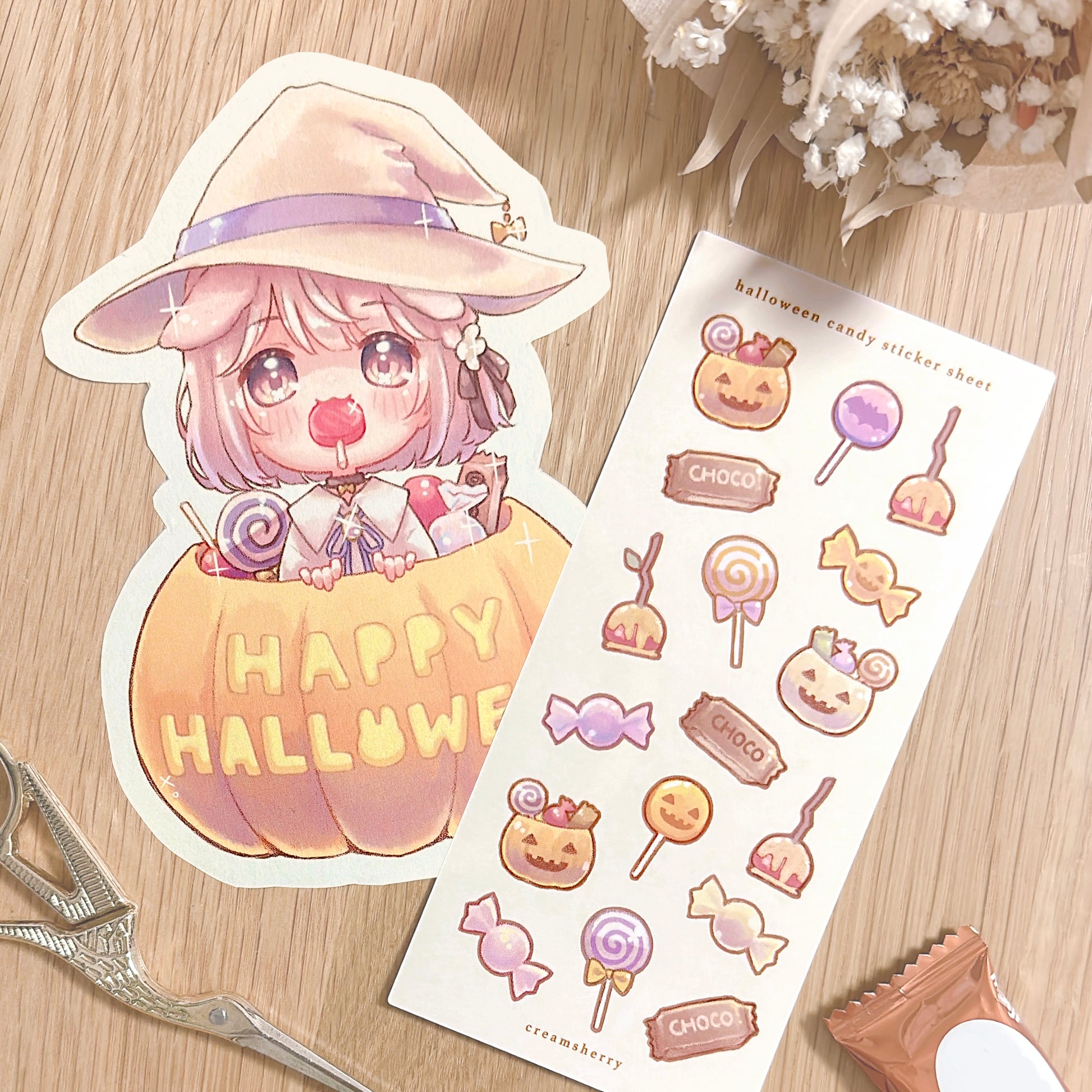 Each postcard is lovingly hand-cut to the shape of sherry in a candy-filled happy halloween pumpkin! 🎃 The matching sticker sheet is filled with halloween-themed candy, and is the perfect size for journaling! 🍭