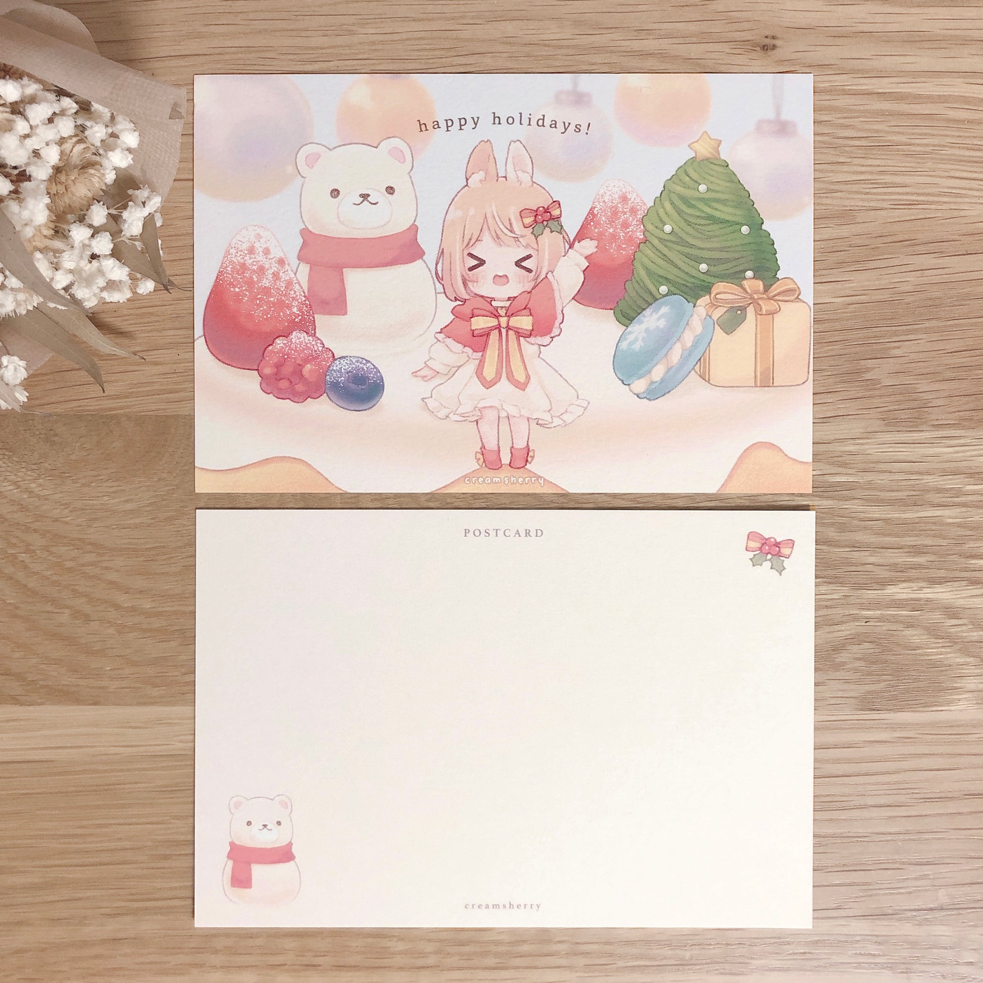 A happy holidays postcard featuring a cheerful bunny sitting atop a frosted cake!